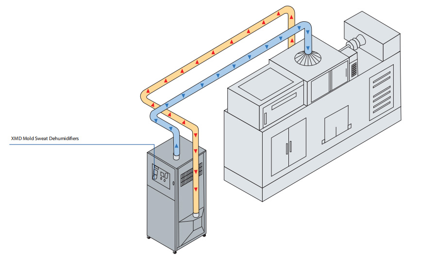 XMD mold dehumidifier is mainly used in plastic and rubber molding. As the mold uses the cooling water to reduce the molding cycle, which results in the problem of water condensation, it is most applicable for PET and XMD bottle shooting out, particularly. 24-hour automatic operation timing setting and automatic malfunction display.